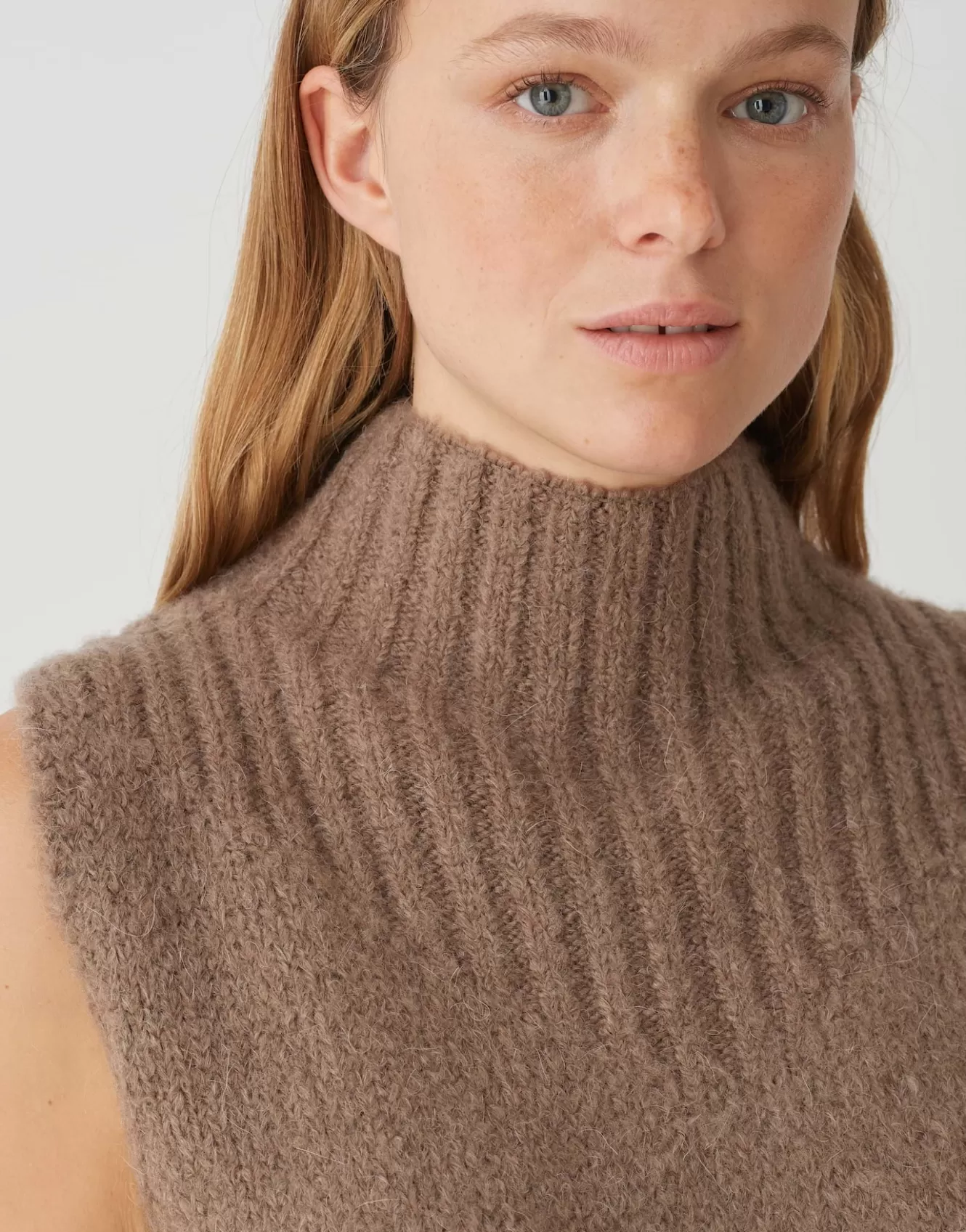 Der Pullunder aus weichem Grobstrick besitzt mit der breiten Rippe am Kragen und Bund einen kernigen Charakter und kreiert unzählige Outfits im Lagenlook.