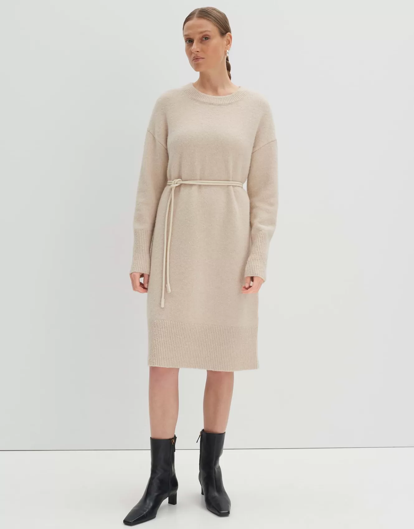Das Strickkleid verfügt über eine leichte Wollmischung und wärmt angenehm ohne aufwendiges Layering.