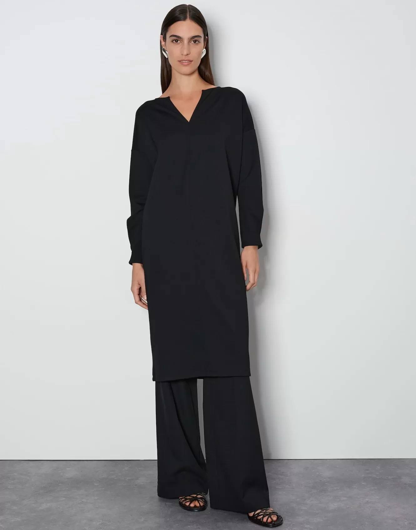 Das Sweatkleid eignet ist ein Wohlfühl Item und eignet sich in der Kombination mit Strumpfhose oder im Layering über eine klassische Hose.